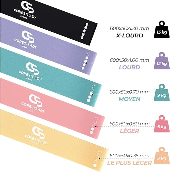 Ensemble de 5 bandes Élastiques Premium. Chaque ensemble comprend: