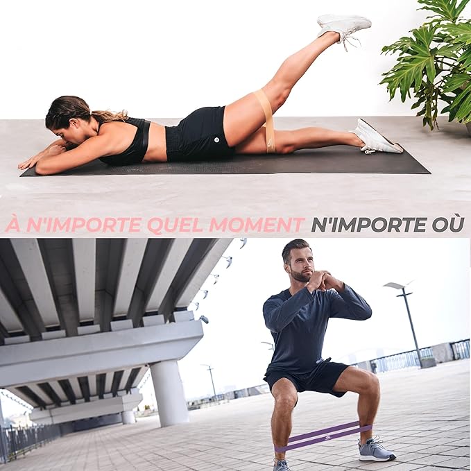 Apportez votre ensemble de bandes de résistance n’importe où ! Que vous vous entraîniez à la maison, au gymnase ou dans tout autre lieu ; vous n’aurez plus jamais besoin de sauter une séance d’entraînement.