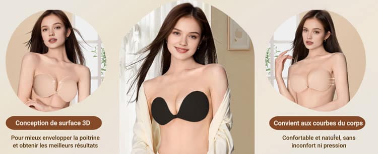 Le maintien adhésif répartit la pression sur la peau et permet de soutenir la poitrine sans compression excessive. Ce mécanisme favorise le galbe naturel et améliore l’apparence de la silhouette.